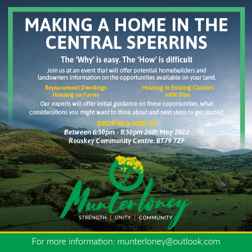 The Munterloney Initiative is hosting a pioneering event in Rouskey Community Centre this Thursday 26 May 2022. The event is aimed at helping local people negotiate the Planning Permission journey that must be travelled by anyone wanting to build a home in the country. A couple of local Chartered Town Planners, Maire McNamee and John Corry, will be on hand from 6:30pm to 8:30pm as volunteers to provide advice and guidance and, hopefully, answer people’s questions. Maire and John will also be supported on the night by Planning staff from the Fermanagh and Omagh Council.