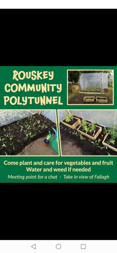 Rouskey CDA planted tomatoes, lettuce, carrots etc. in polytunnel and planted peas, beans and kale outside and will need help with watering, feeding and weeding veg. Please get in touch to join in and help out.