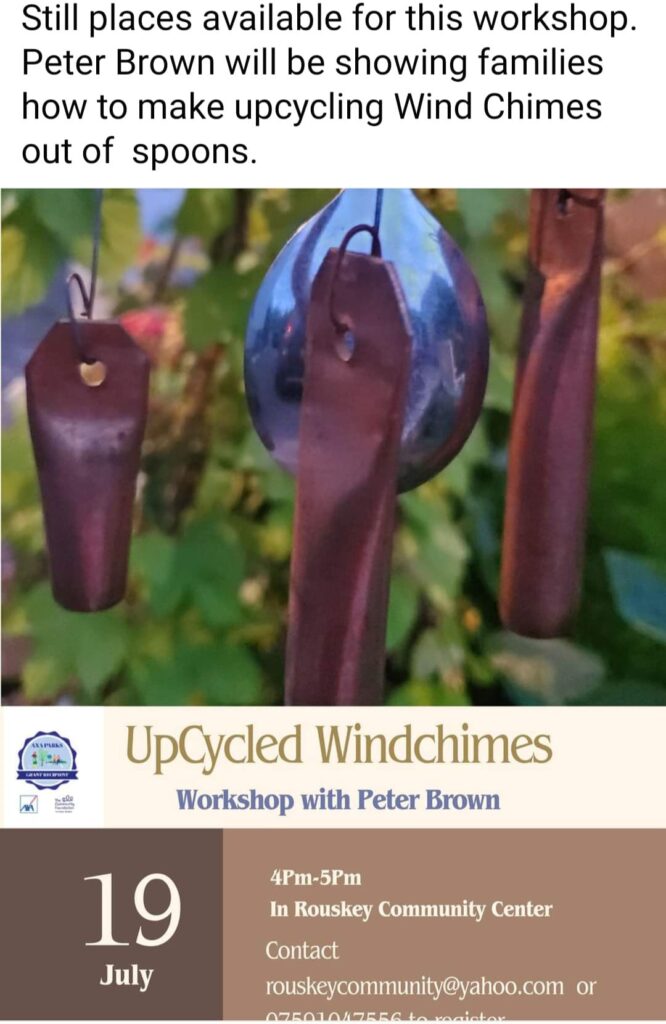 Still places available for this workshop. Peter Brown will be showing families how to make upcycled wind chimes out of spoons.